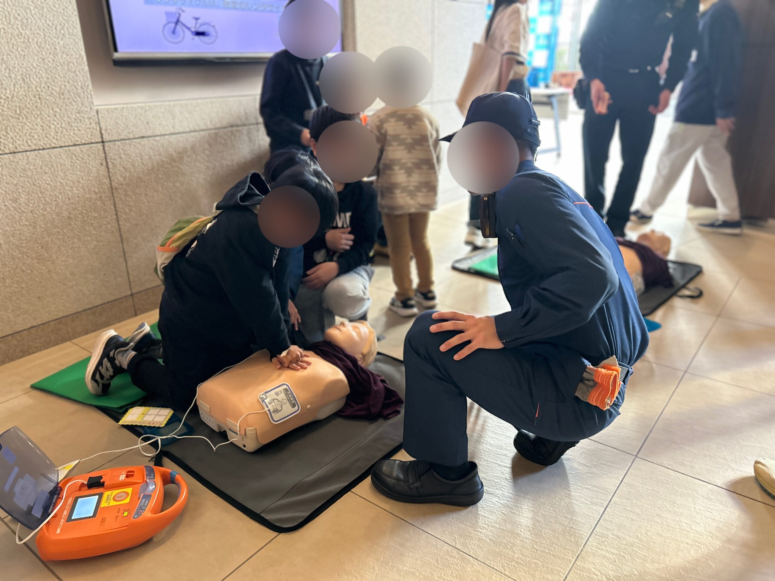お子さんも実践!消防署の方からマンツーマンで教えてもらいながら、AEDの使い方をマスターしました