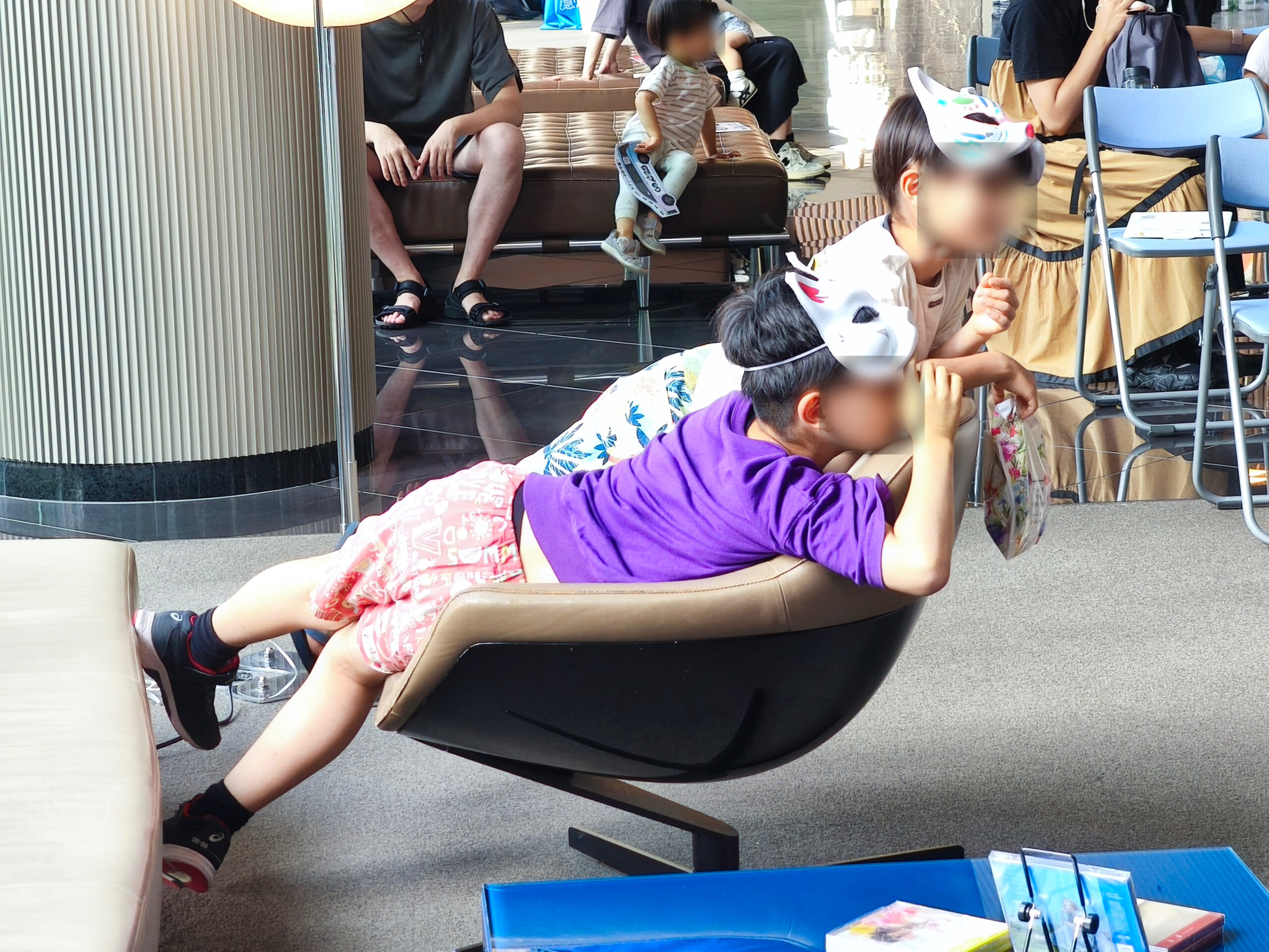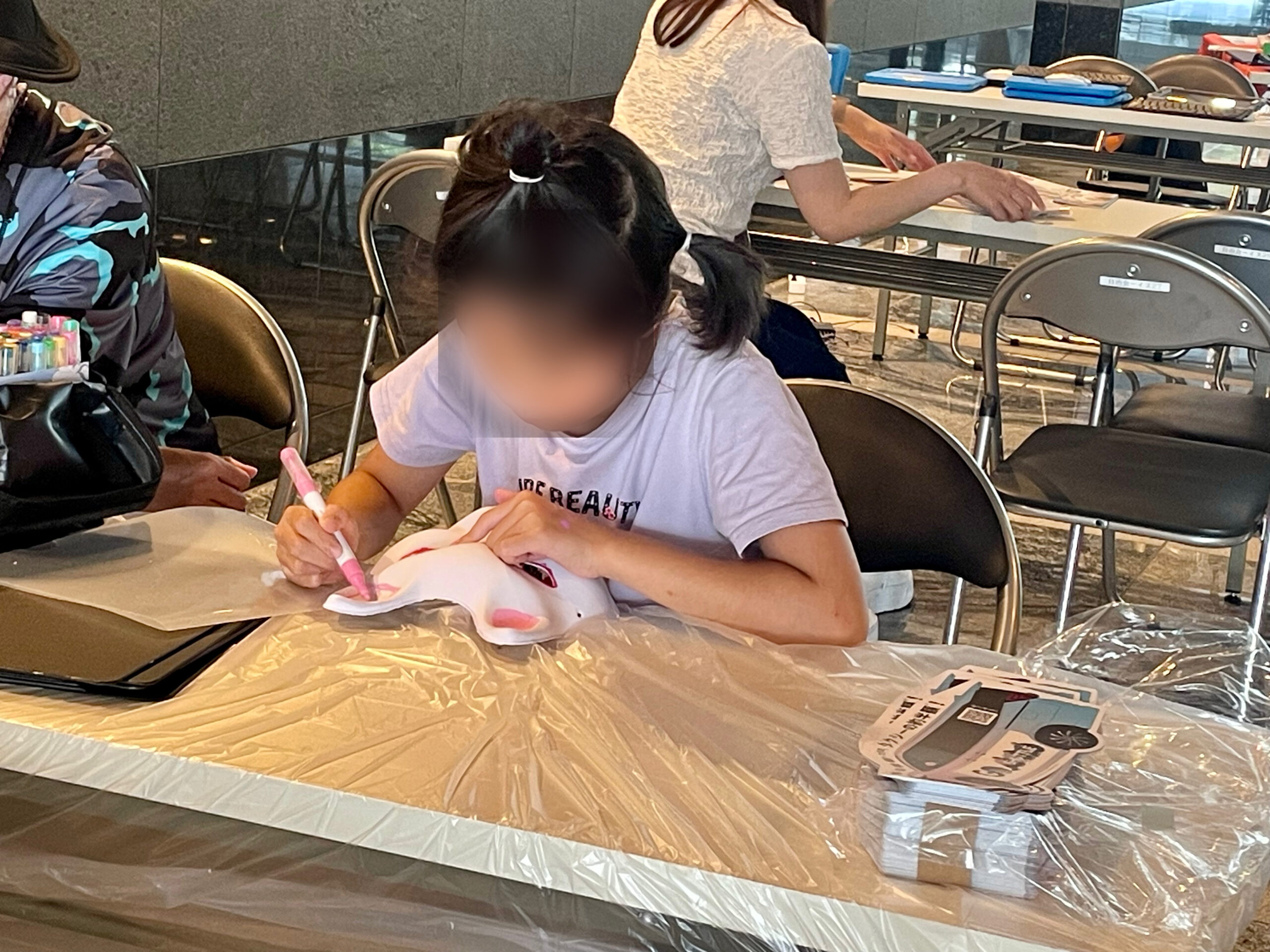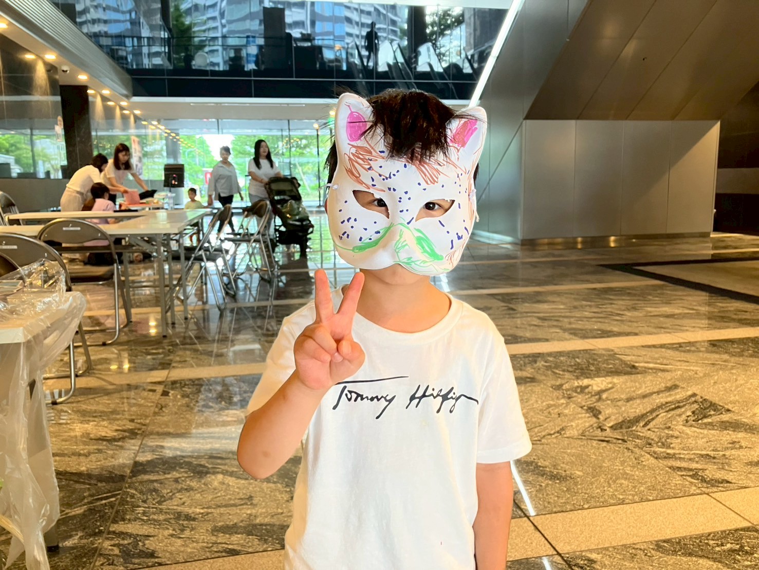 この日つくったお面は、8月にマンションで開催した盆踊り大会でも使用できるようになっています。ですが、多くのお子さんたちは完成後すぐにお面を身につけ、ロビーやイベントスペースを歩いたり、ほかのイベントを楽しんだりと、思い思いに満喫していてくださいました!