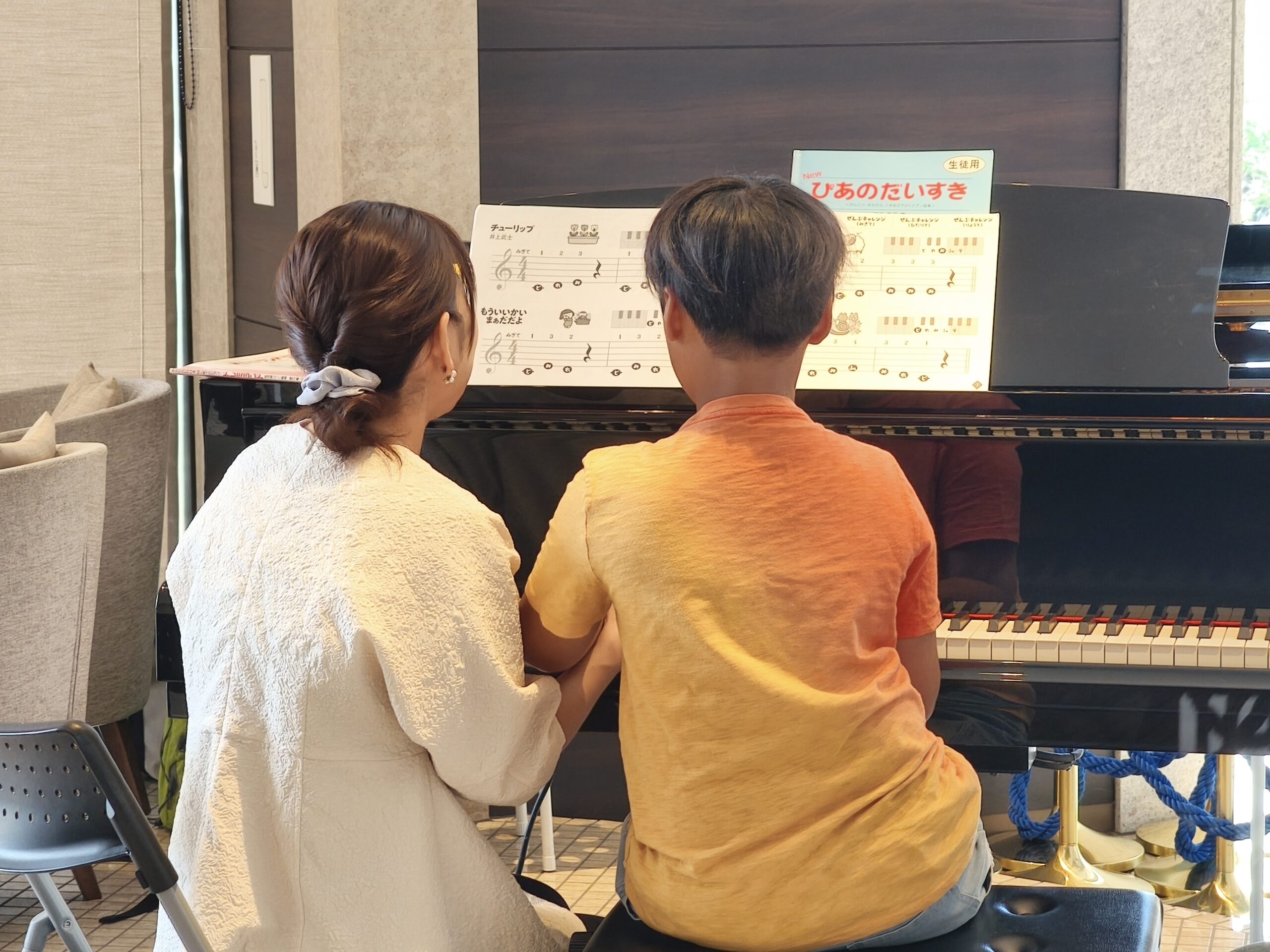 このピアノ出張レッスンでは、ピアノ指導者賞を受賞した実績がある先生が、希望者に30分程度のピアノのレッスンを実施しました。生き生きとしたピアノの音色は、エントランスいっぱいに響き渡り、住民を魅了しました。